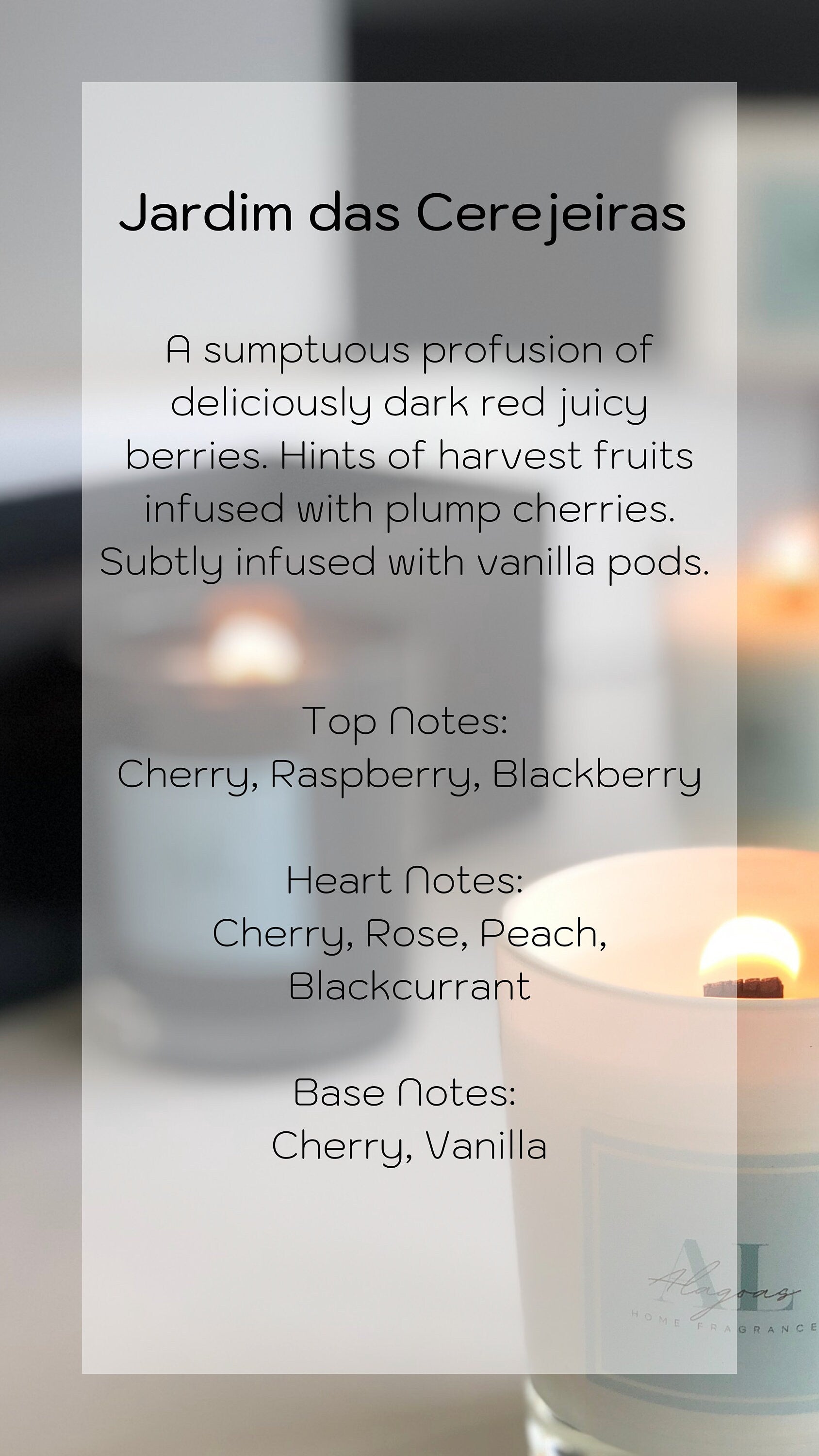 Jardim das Cerejeiras or Cherry Garden is a sumptuous profusion of deliciously dark red juicy berries. Hints of harvest fruits infused with plump cherries. Subtly infused with vanilla pods.